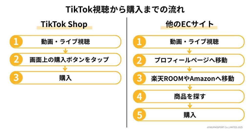 一方、TikTok Shopでは、ライブ配信や動画から直接購入ページへアクセスできます。視聴者が興味を持った瞬間に、そのまま購入まで進めるため、購入につながりやすい特徴があります。